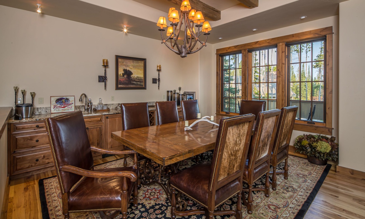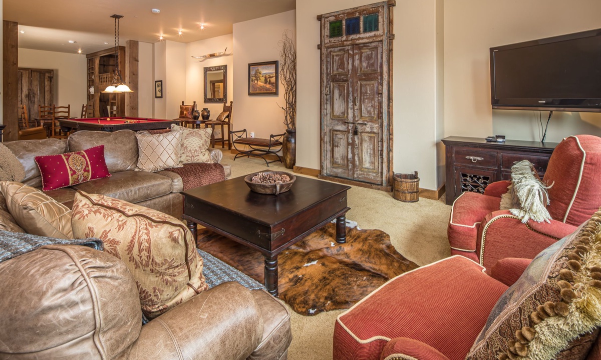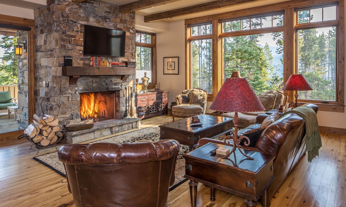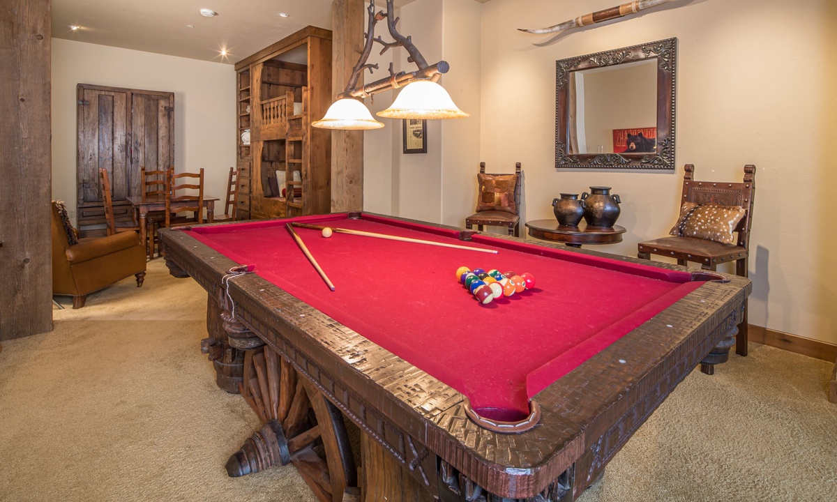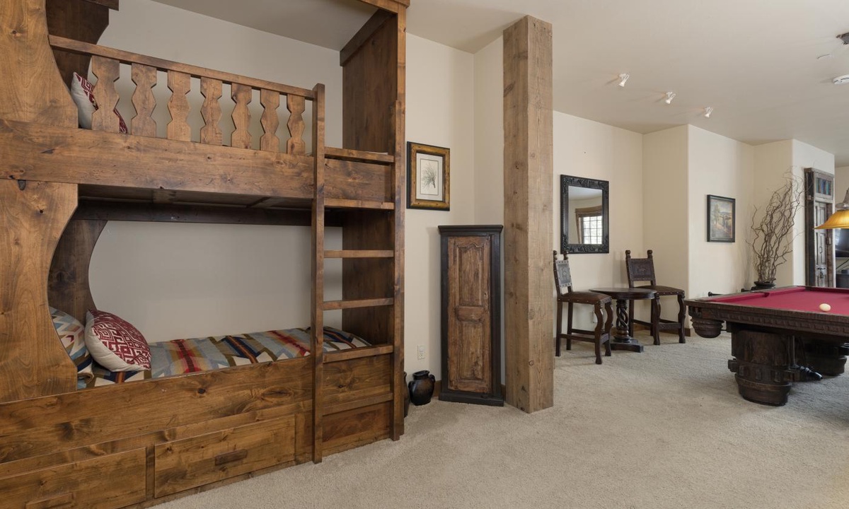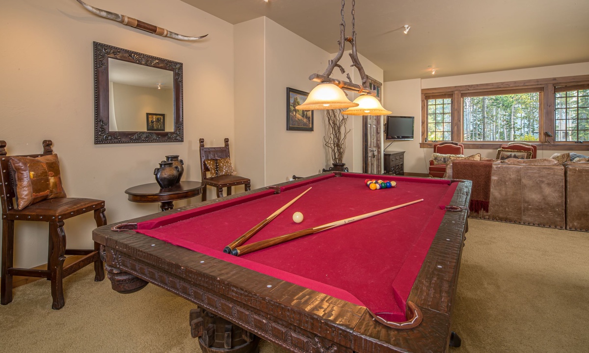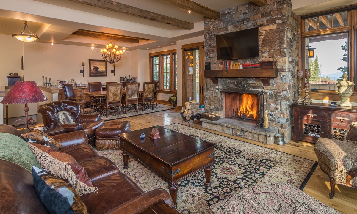 This spacious 4,100+ sq ft Cowboy Heaven Luxury suite is set over three levels and is beautifully appointed with multiple living spaces for large groups to enjoy comfort, privacy and the best in home entertainment. The open plan great room is elegant and inviting with timeless interiors, a welcoming wood burning fireplace, flat screen TV for your entertainment and a luxurious dining area for long, lazy home-cooked meals. The custom kitchen has all you need to cook for a large crowd with high-end stainless appliances, plenty of granite counterspace and modern kitchen amenities. On the lower level of the home is a spacious family room with plenty of comfy seating, a flat screen TV, pool table and custom twin bunks. This luxury Moonlight Basin suite boasts plenty of space to gather with friends and family and create Montana memories.