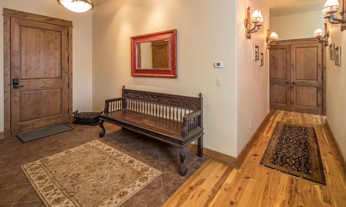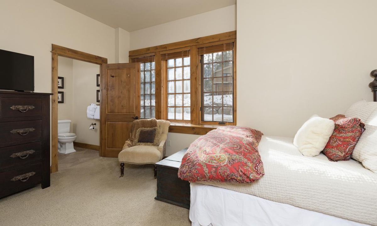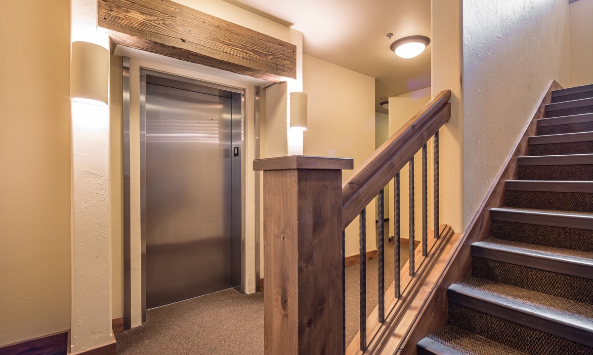Access is located out the front door on the main level (with main level ski locker next to front door). A 10 yard walk out the front door to the right, and you are on your skis. Proceed on Bear Paw access trail about 50 yards to junction with Natawista run. Run has good pitch (snowboard friendly) all the way down to Madison Base Area and the Six Shooter lift.